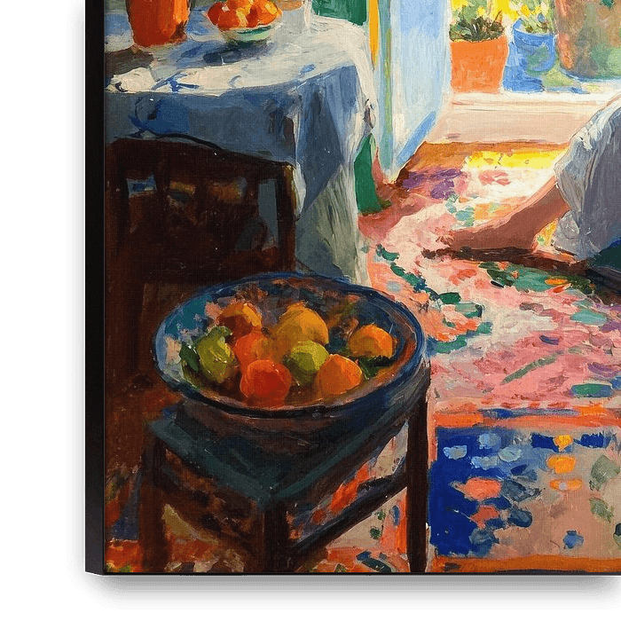 This vibrant painting captures a summer morning full of warmth and light. In a colourful room with open doors, a woman sits quietly by the window, bathed in sunlight. She wears a white robe that reflects the light beautifully, while holding an orange in her hand. Outside, greenery blooms with life, and inside, a carpet of bright colours…