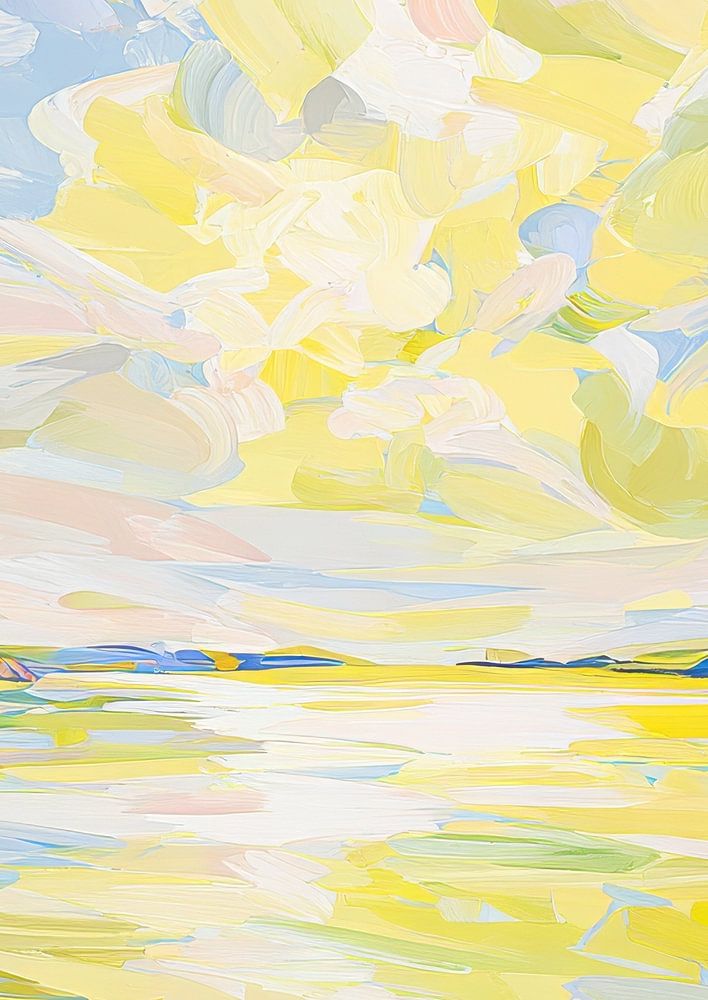 This abstract oil painting shows the sun shining over a calm body of water in soft shades of yellow and sky blue. Soft lines and shapes form harmonious waves, while colourful sunbeams bring the scene to life. The water reflects the sky and the sun like a mirror, enhancing the peaceful atmosphere. The wide-angle composition and impressionistic influences create depth and expanse, conveying a sunny, calm day full of light and lightness. A harmonious, meditative depiction of nature, light and colour that combines minimalism and impressionistic elegance.