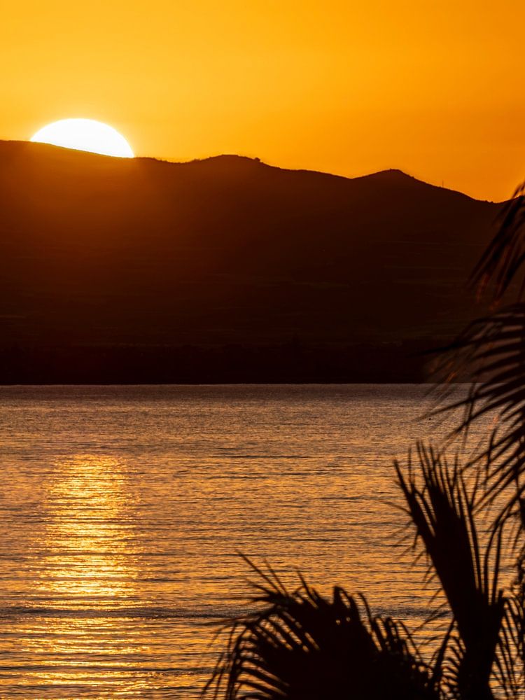 Sunrise with a palm tree in the foreground as seen from Almuñécar, Spain