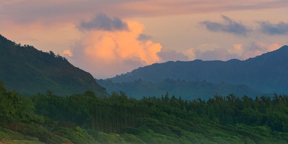 A panoramic photo of a sunrise on one of the beaches of Kauai, one of the Hawaiian Islands, located in the Pacific Ocean.