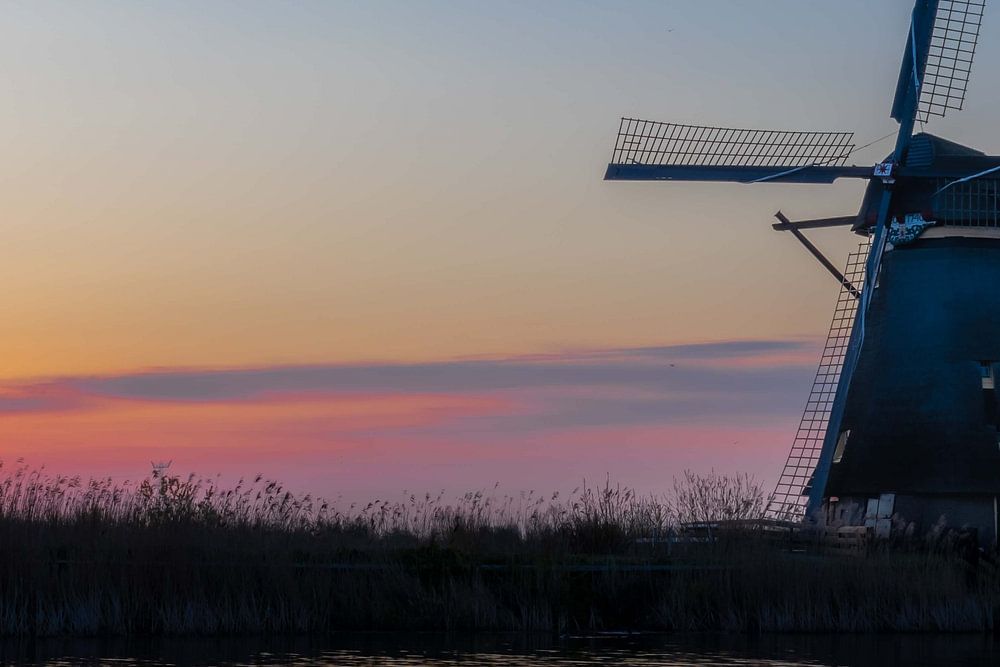The sunrise in Kinderdijk, where this photo was taken just before the sun really rises. This creates beautiful colors in the sky!