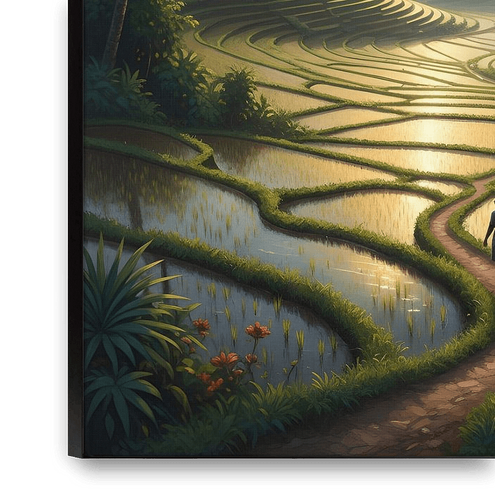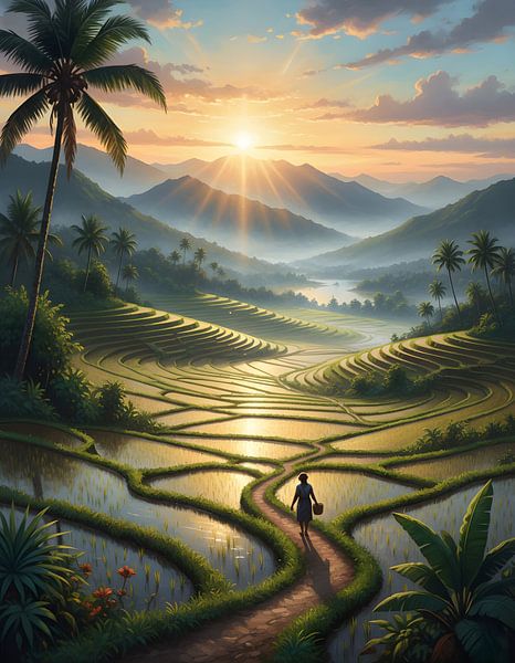 This is a stunning and panoramic painting of a terraced rice field landscape, likely at sunrise or sunset, given the warm golden light. A solitary figure walks along a winding path through the water-filled paddies. The scene is incredibly detailed, with the intricate patterns of the rice terraces reflecting the vibrant sky and the sun's…
