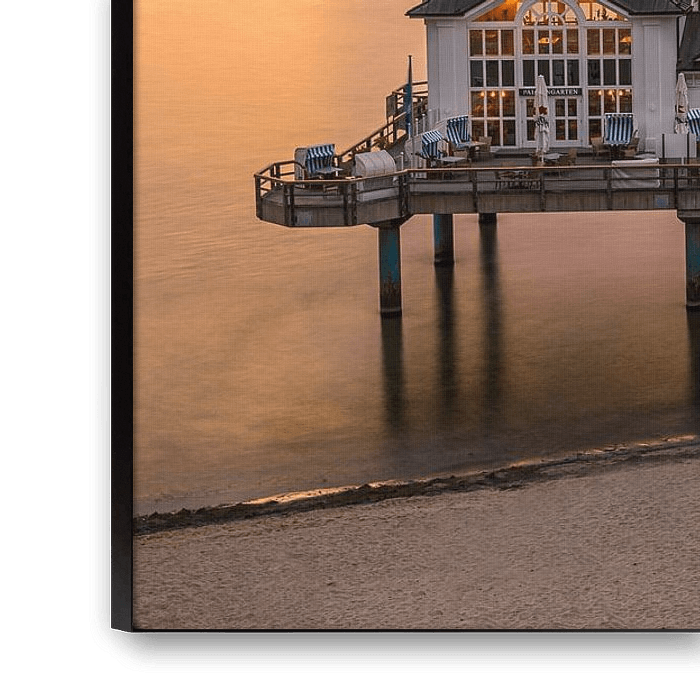 Sunrise at the Sellin Pier (German: Seebrücke Sellin) is a pier in the Baltic resort of Sellin on the German island of Rügen. The pier has a restaurant near the beach above the water and has a diving gondola.