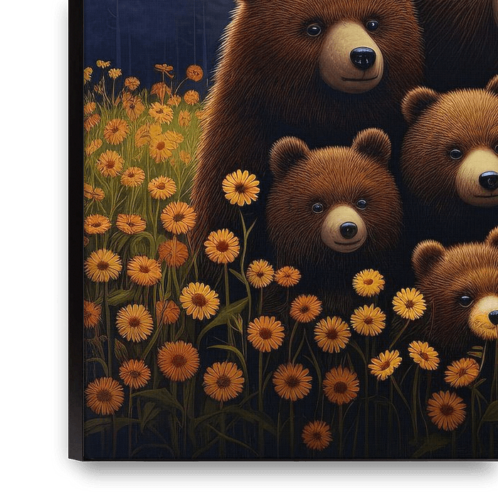 Buy this digital art artwork Sunrise Serenade: Whimsical Bears in Sunflower Field by Vincent Monozlay as a reproduction on canvas, ArtFrame, poster and wallpaper, printed on demand in high quality.