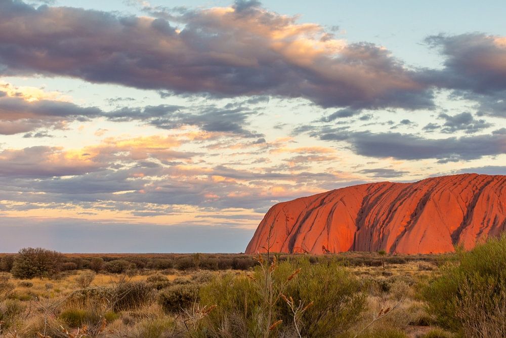 Beautiful landscape of the famous Ayers Rock (also known as Uluru) in Australia during sunrise. In the foreground is a grassy landscape followed by the large mountain. The red colour of the mountain stands out from the first rays of sunlight of the day. Above the mountain is a beautiful cloud deck where large patches of blue sky can still be seen.