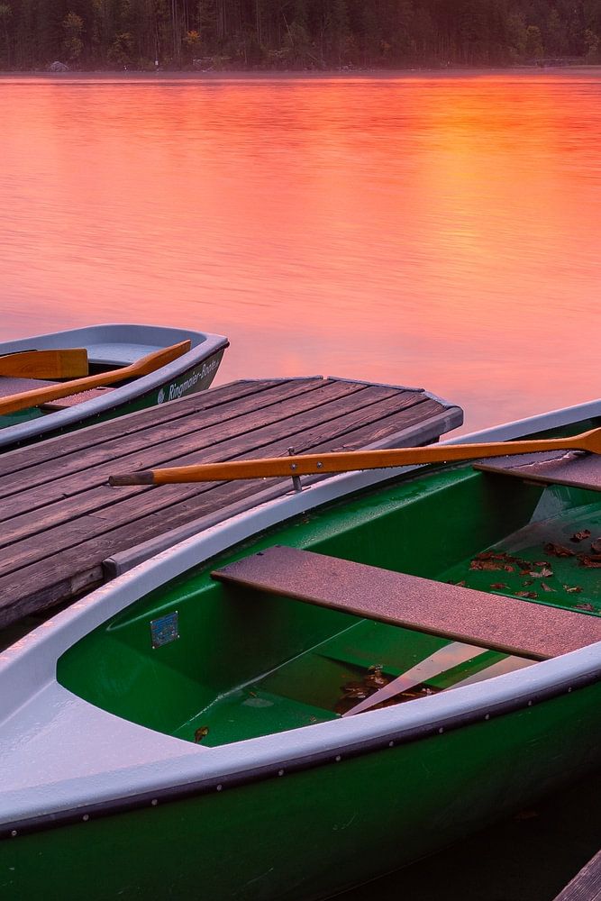 The rising sun bathes the sky in fantastic colours at Hintersee in Ramsau.
