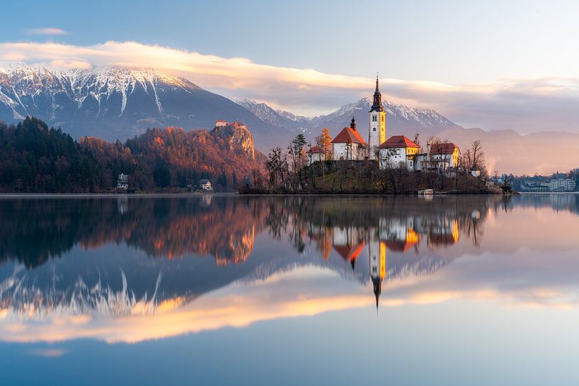 Buy this landscape artwork Sunrise at Lake Bled by Tijmen Hobbel on canvas, ArtFrame, poster and wallpaper, printed on demand in high quality.