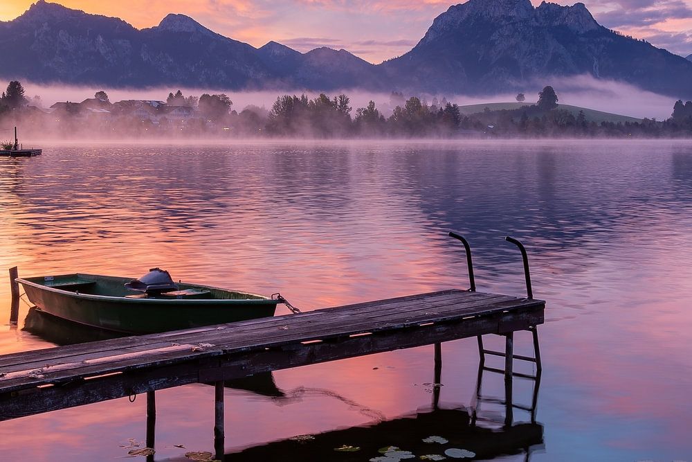 Footbridge on Lake Hopfensee in the Allgäu on a beautiful autumn morning