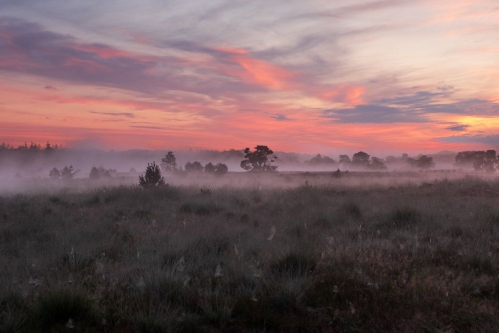 An atmospheric sunrise on the Leersumse Veld. A thin layer of mist creates a fine mystical atmosphere.