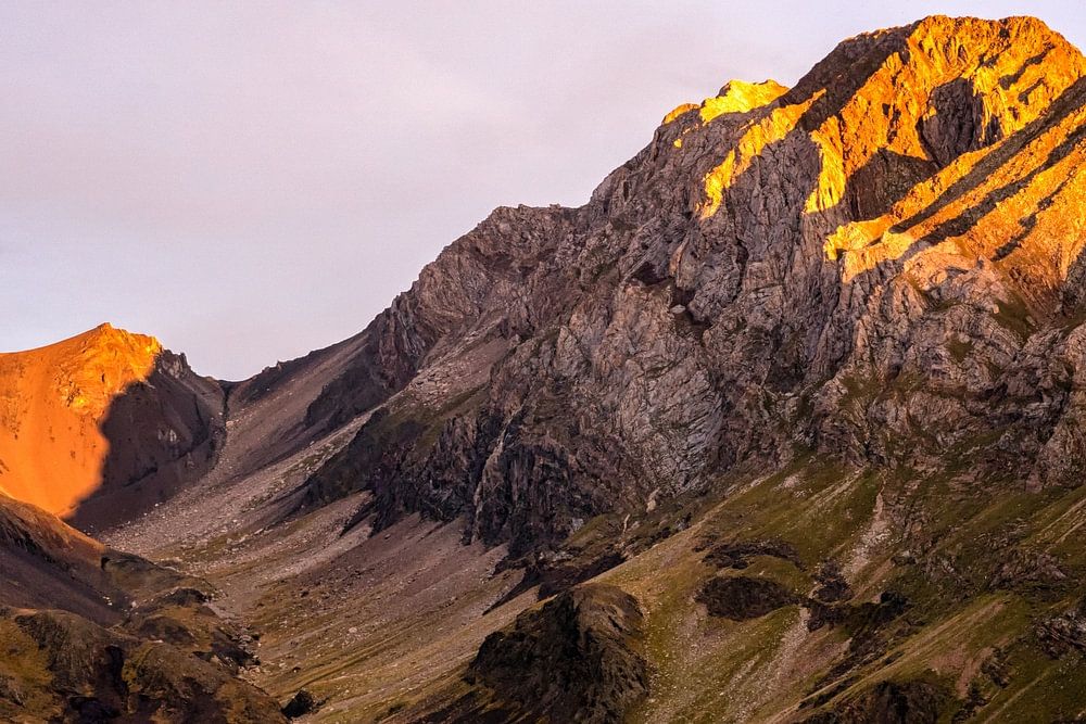 Sunrise view over the mountains from Embalse de Llauset in Posets Maladeta National Park in the Aragonese Pyrenees, Spain.