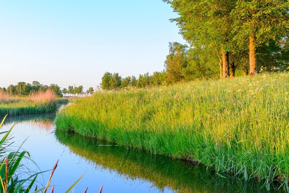 Early morning sunrise during a beautiful springtime day over the Zwartendijk, the old Zuiderzee levee in the IJsseldelta near Kampen in Overijssel The Netherlands.