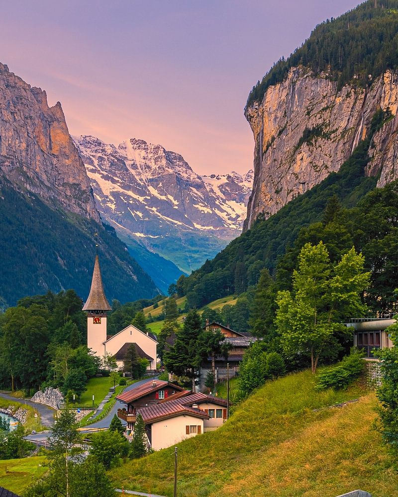 A vertical 4:5 photo of a summer sunrise in Lauterbrunnen, a municipality in the district of Interlaken-Oberhasli in the Swiss canton of Bern.