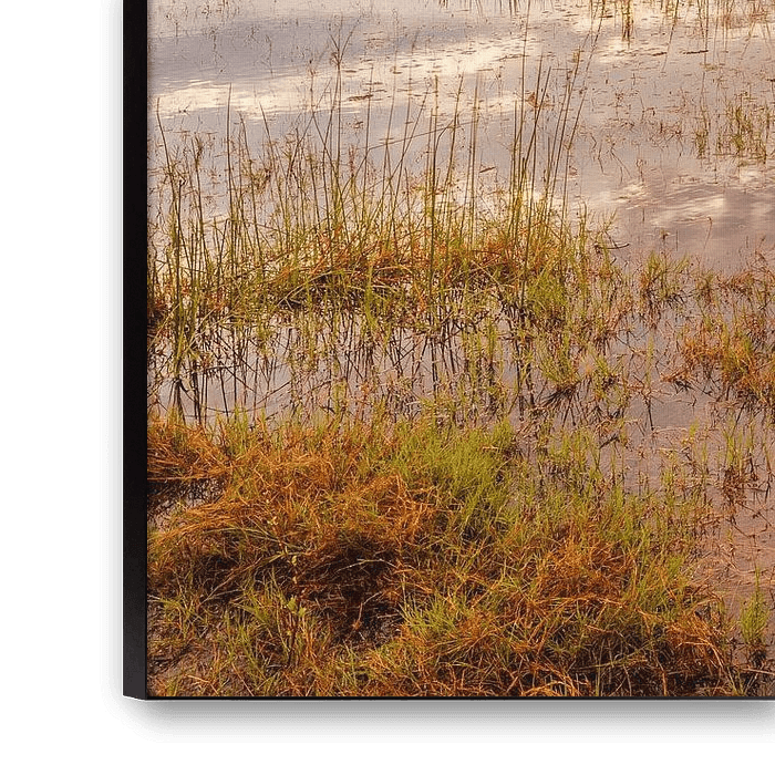 This serene work shows a beautiful sunrise in the Okavango delta in northern Botswana during the wet season. We see vast wetlands with shallow water in which the sky reflects beautifully as the sun rises. The golden light of sunrise falls over the green reeds, grasses and scattered trees. This peaceful open landscape seems to offer a refuge away from the busy city life.