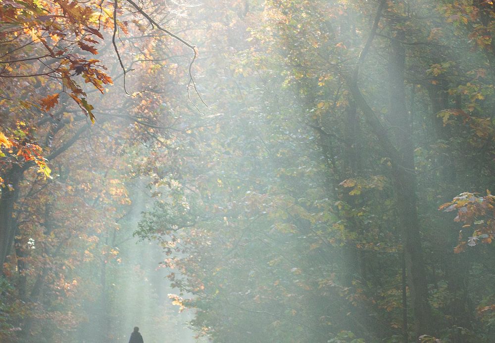 The first rays of sunlight of the day shine through the trees of the autumn forest. The sun makes the autumn colours sparkle like gold. The runner enjoys the morning sunshine in nature. At this time of year, the colours of the forest are at their best colours like reds, oranges, yellows, browns and just a little bit of green.