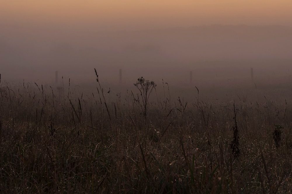 A misty morning in the dunes of Oostkapelle. Slowly the sun rises and gives this misty landscape an orange-golden glow. The dewdrops glisten in the rising sunlight and the grasses and plants become more and more visible.