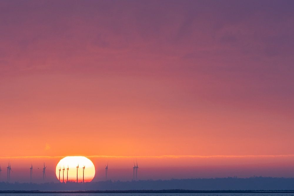 The sun rising just above the horizon and giving a beautiful red morning glow over the Veerse mee in Zeeland. In front of the big red sun are a couple of windmills.