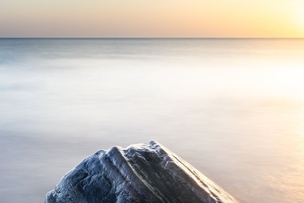 Immerse yourself in the enchanting natural scenery of Fehmarn: this photo whisks you away to a tranquil stretch of coastline where a single stone rests in the gentle waves of the Baltic Sea. The special light of the sunrise colours the sky in warm nuances, while the long exposure technique gives the water a dream-like appearance reminiscent of morning fog.