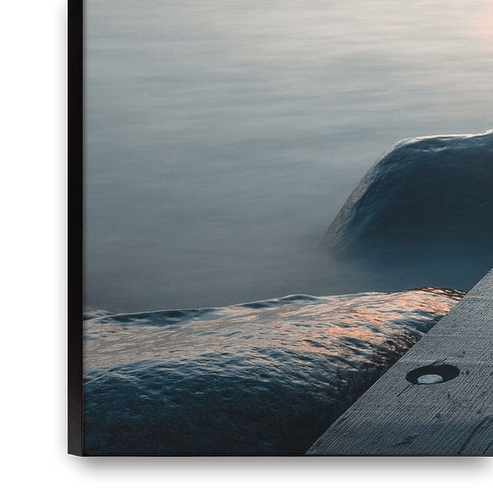 This photo transports you to a quiet stretch of coastline where a single stone rests in the gentle waves of the Baltic Sea. The special light of the sunrise colours the sky in warm nuances, while the long exposure technique gives the water a dream-like appearance reminiscent of morning fog.