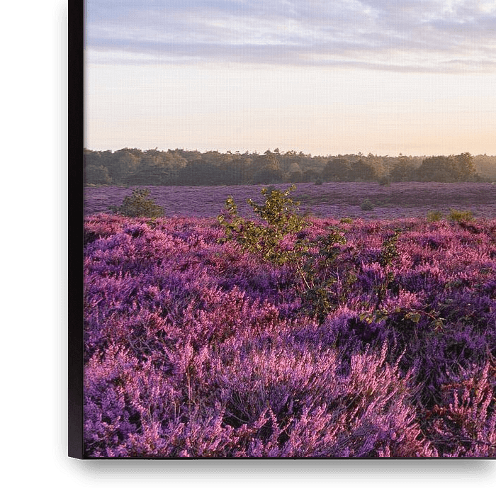 This photo shows a breathtaking sunrise on the Postbank, surrounded by the vast and colourful heathland in full bloom. The golden morning light casts a warm glow over the landscape as the sun slowly rises above the horizon, filling the sky with soft pastel colours. The purple flowers of the heather stand out beautifully against the…