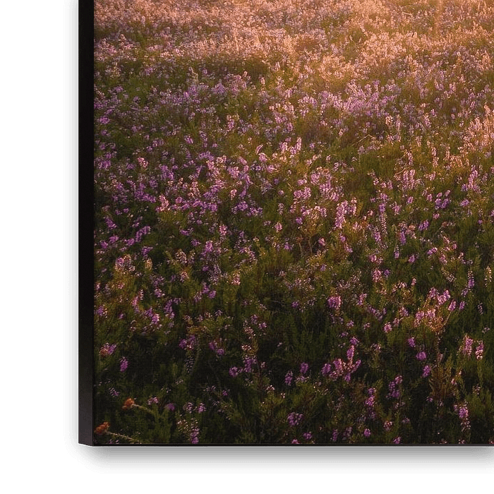 Just before I took this picture the whole sky was still cloudy. But around sunrise the clouds moved aside and the first rays of sunshine appeared trees the purple heather. This photo brings the warm feeling of late summer into your home.