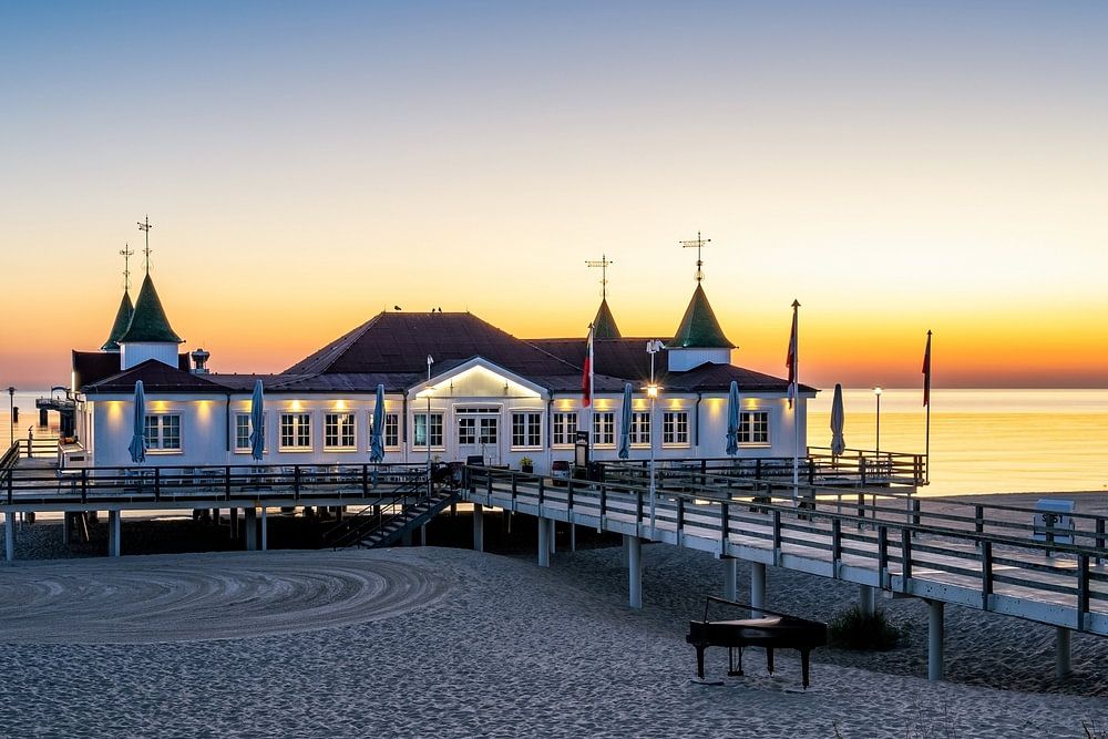 Sunrise on the pier in Ahlbeck on the island of Usedom on the Baltic Sea