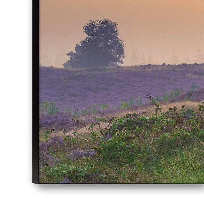 Sunrise over the blossoming common heather plants (Calluna vulgaris) in the Veluwe nature reserve at the Renderklippen heathland landscape during sunrise in summer.