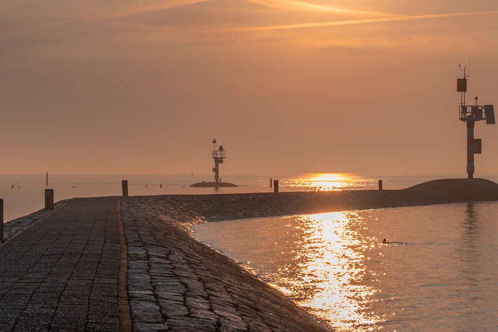 Sunrise over a pier, a warm light shines over the Wadden Sea.