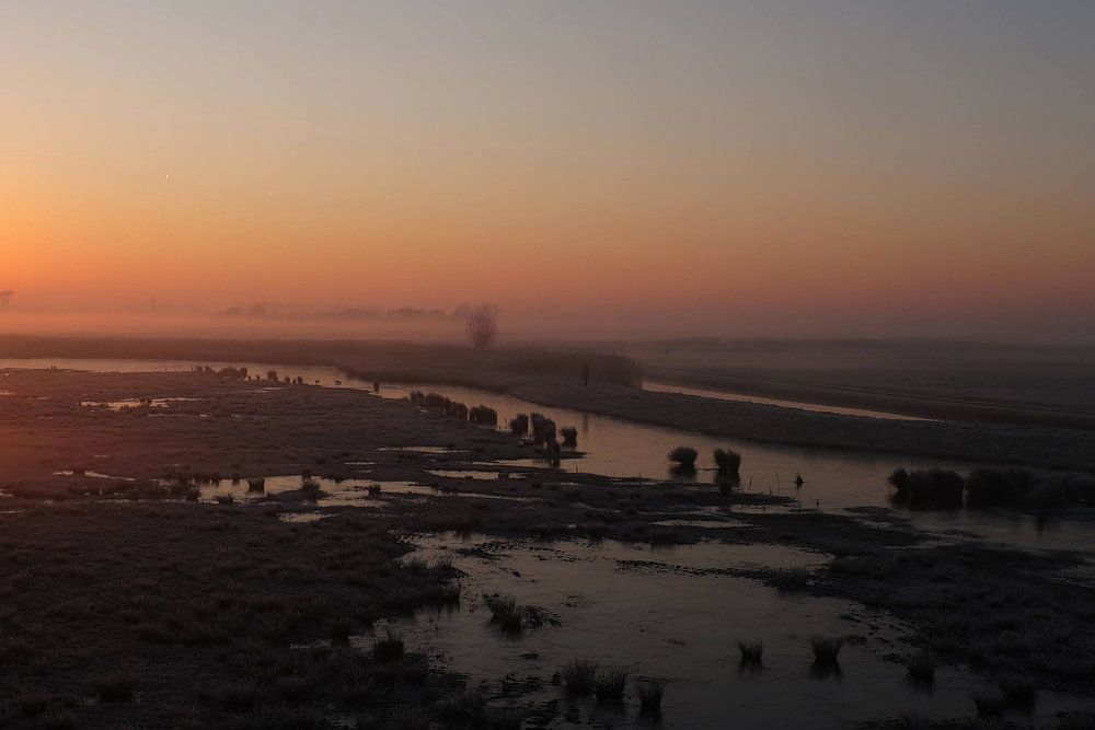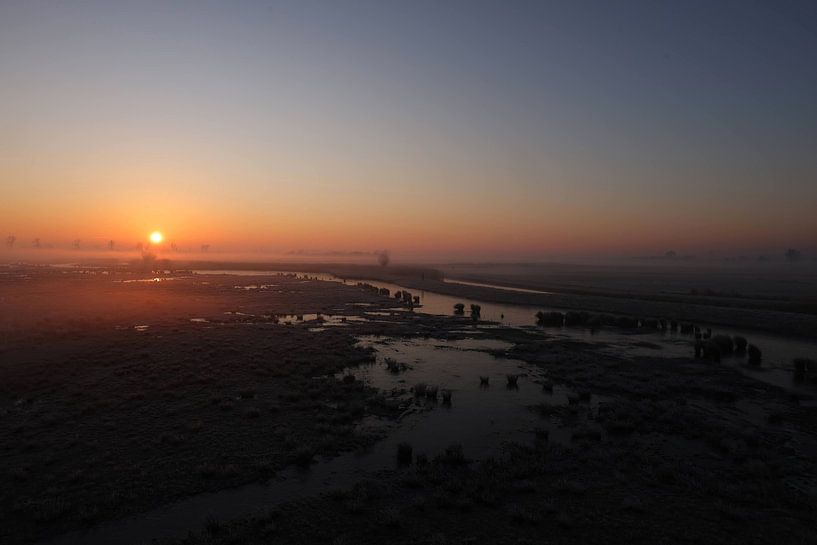 A serene sunrise over the Binnenveldse Hooilanden, where mist and water come together in a quiet, expansive landscape.