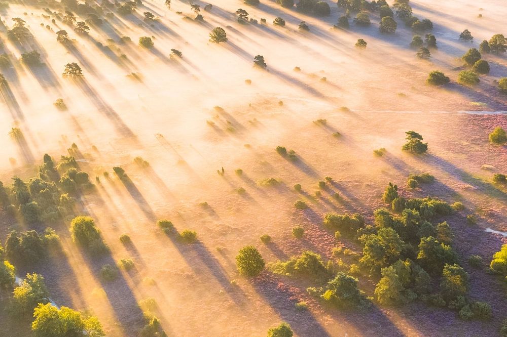 A misty sunrise over the Drouwenerzand in Drenthe. The Drouwenerzand is a nature reserve with drifting sands and is located on the Hondsrug.