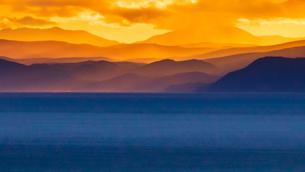 Morning sun over the Mediterranean Sea with view to the Moroccan Rif Mountains