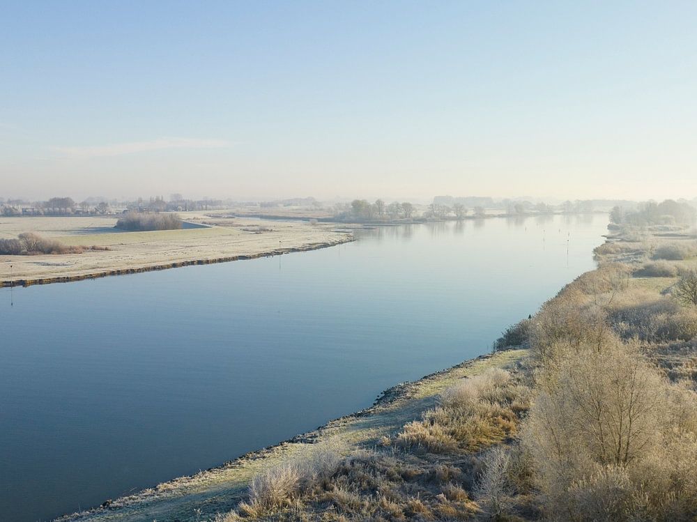 Sunrise over the river IJssel in the IJsseldelta during a cold winter morning. Panoramic landscape with the winding river with frost over the meadows and floodplains..