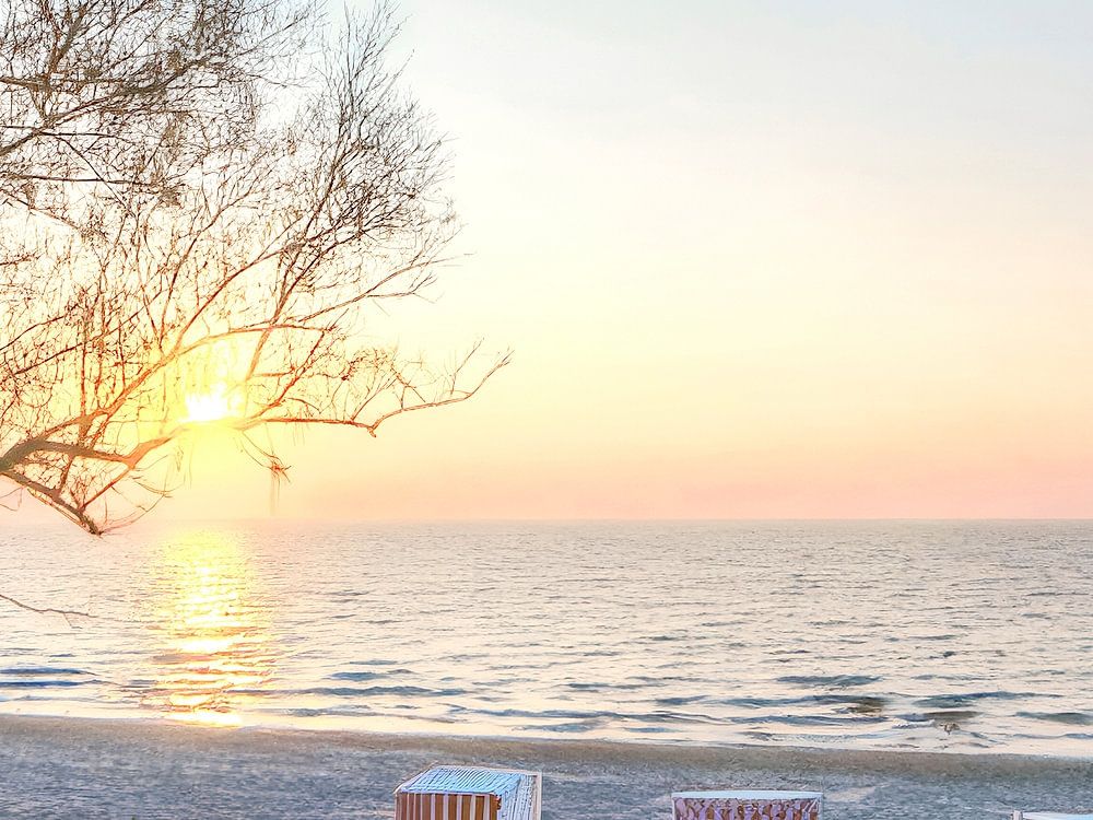 The first rays of sunshine of the day. The beach chairs are still empty.