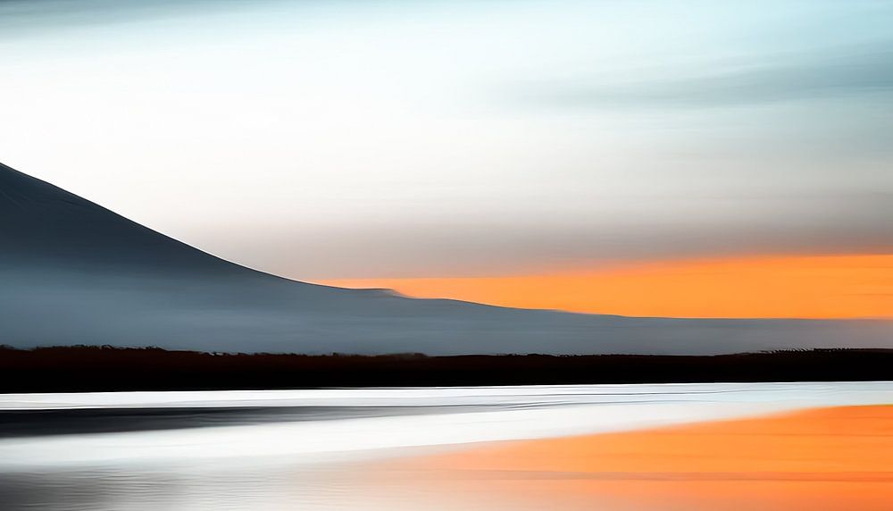 The picture describes an idyllic sunset by the sea... The orange-coloured sunset stands in harmonious contrast to the monochrome surroundings.....This is a digital art image that I created - derived from my own image material as a reference - with the help of tools for composing, AI generation and fine-tuning.