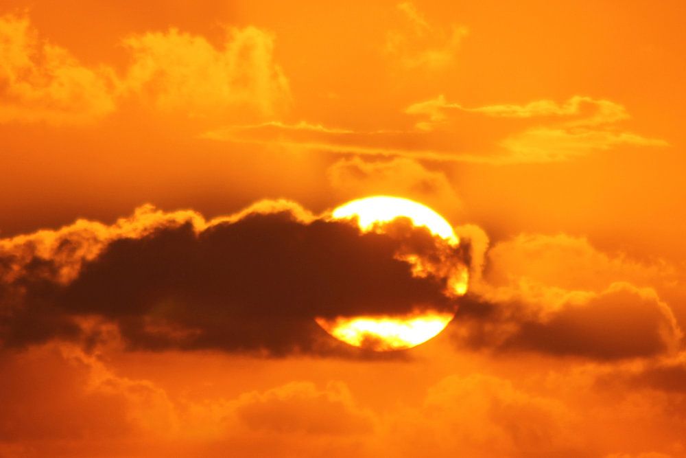 Fraaie zonsondergang in Katwijk aan Zee. Aan de rechterkant de gevel van Hotel Noordzee