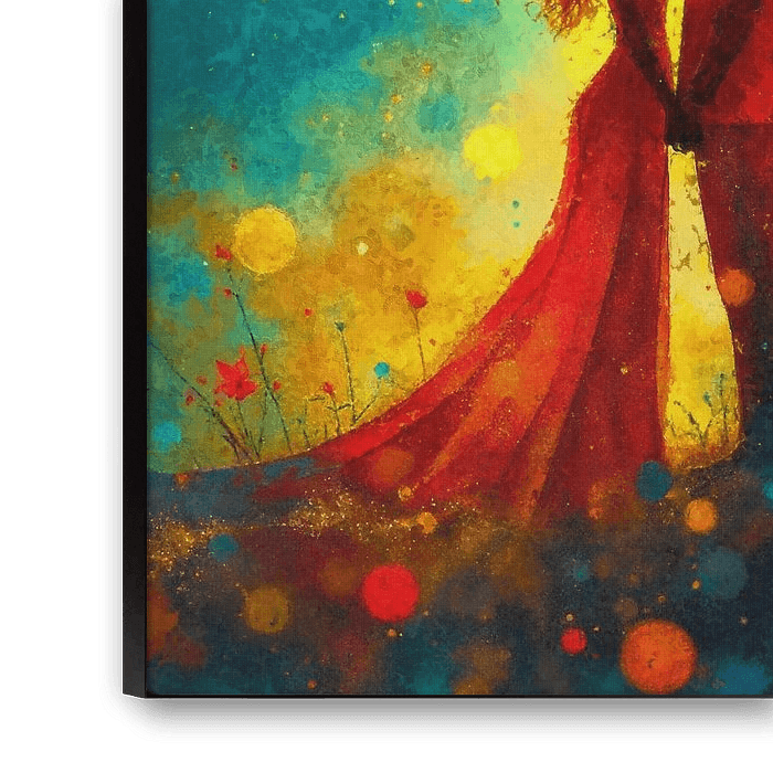This artwork has been created with digital painting techniques, giving it a playful textural effect reminiscent of an impressionist canvas. The combination of deep red tones, sparkling blue accents and a dreamy light effect makes this work a real eye-catcher in any interior.