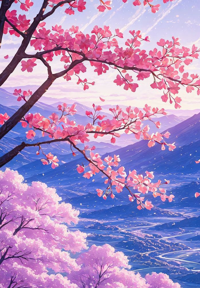 dawn of blossoms, cherry blossom sunrise, sakura mountain path, Japanese spring art, glowing horizon, peaceful landscape, blooming morning, pastel scenery