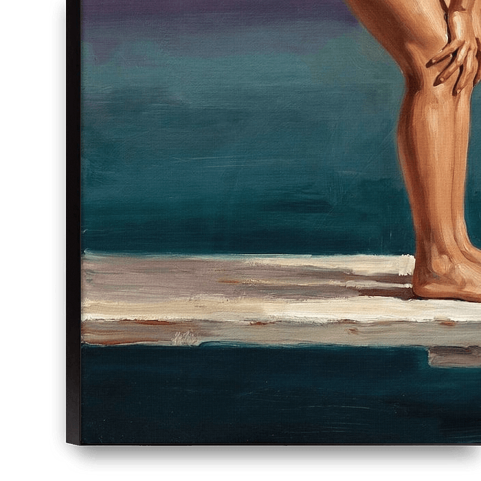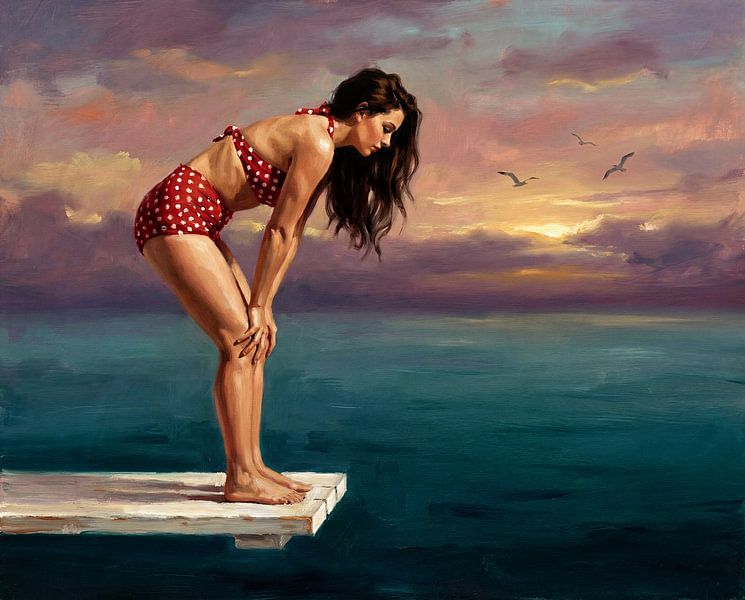 This painting captures a moment of poised anticipation, where the subject—a woman in a red polka-dot bikini—stands on the edge of a diving board, gazing down into the water below. From the artist's perspective, it’s a study of contrasts: the vibrant warmth of the sunset against the cool, tranquil blues of the water, the stillness of the…