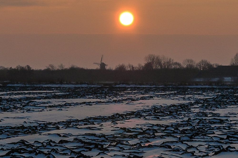 Sunset in winter over a field with snow and skyline with churchtower and windmill of a village in the North of Holland / Sunset in winter over a field with snow and skyline with churchtower and windmill of a village in the North of Holland