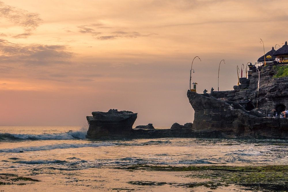 Sunset at Pura Tanah Lot on Bali in Indonesia. This is a Balinese temple which lies in the sea on a rock. At low tide you can reach the temple over a sand dam.