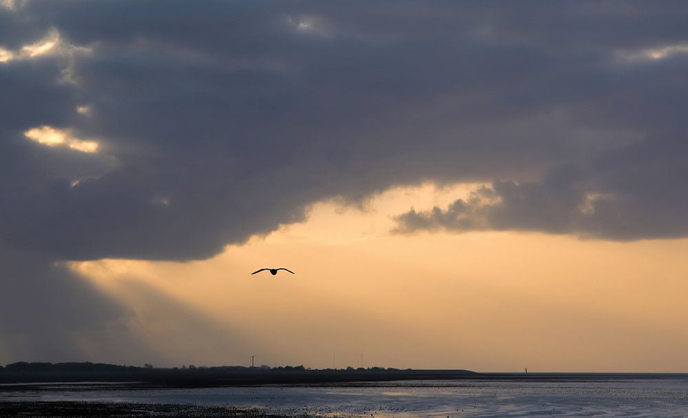 A sunset on the Wadden Sea on the dike of Lauwersoog. A strong wind with beautiful clouds and as a surprise a flying bird in the right place on the photo! Photo was taken during low tide and the sea left food for the birds.