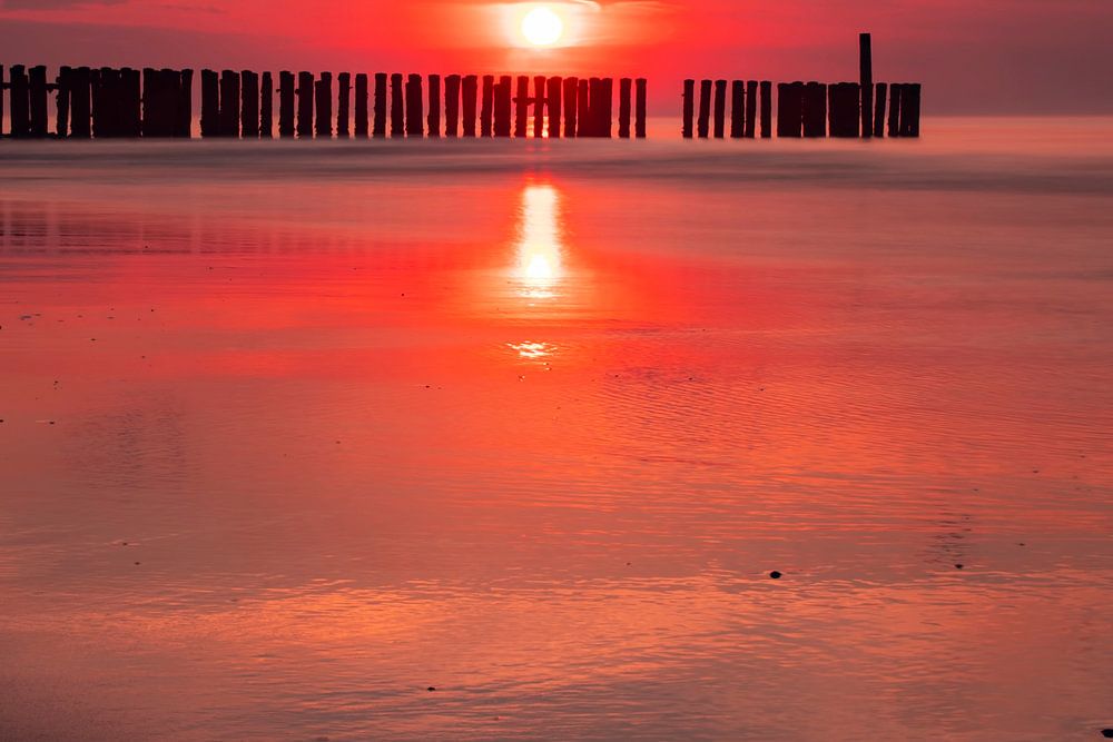 A sunset on the North Sea coast near Westkapelle in Zeeland, the Netherlands. You can also see the wooden breakwaters far out to sea.