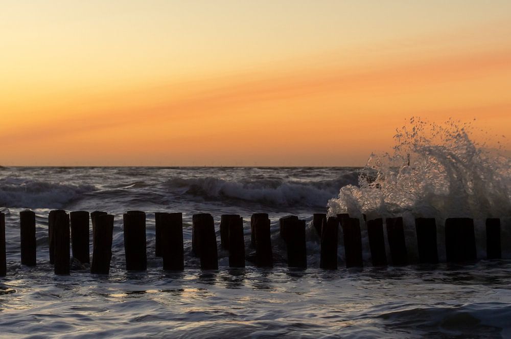 Sunset in Westkapelle, Zeeland, the Netherlands. After the sun had just set, beautiful orange, red and yellow colours appeared in the sky. Water waves splashed high on the breakwater in the foreground, creating an atmospheric plate.