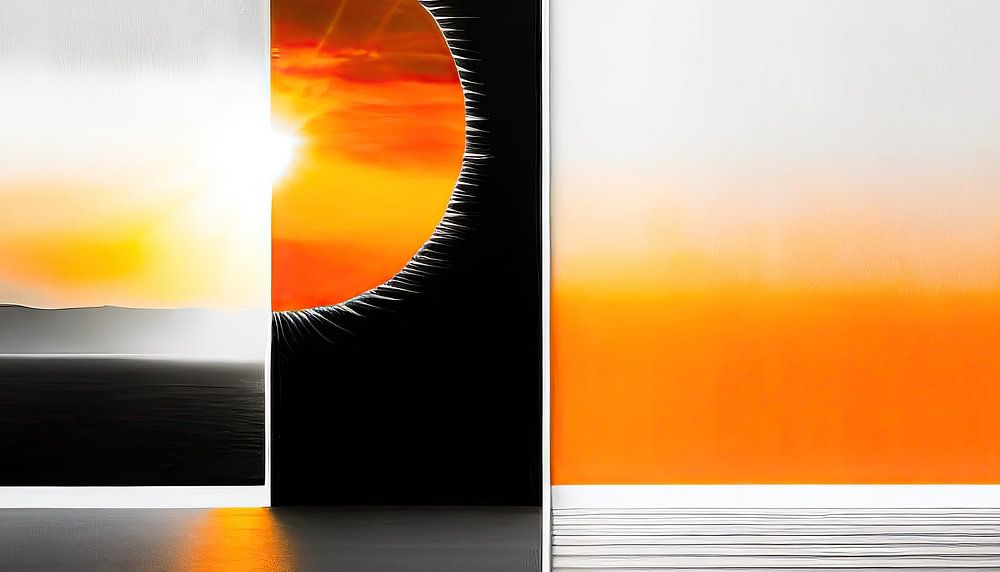 Abstract, painterly picture of a sunset by the sea. Multi-part composition. Digital art with application of AI generation, composing and image fine-tuning