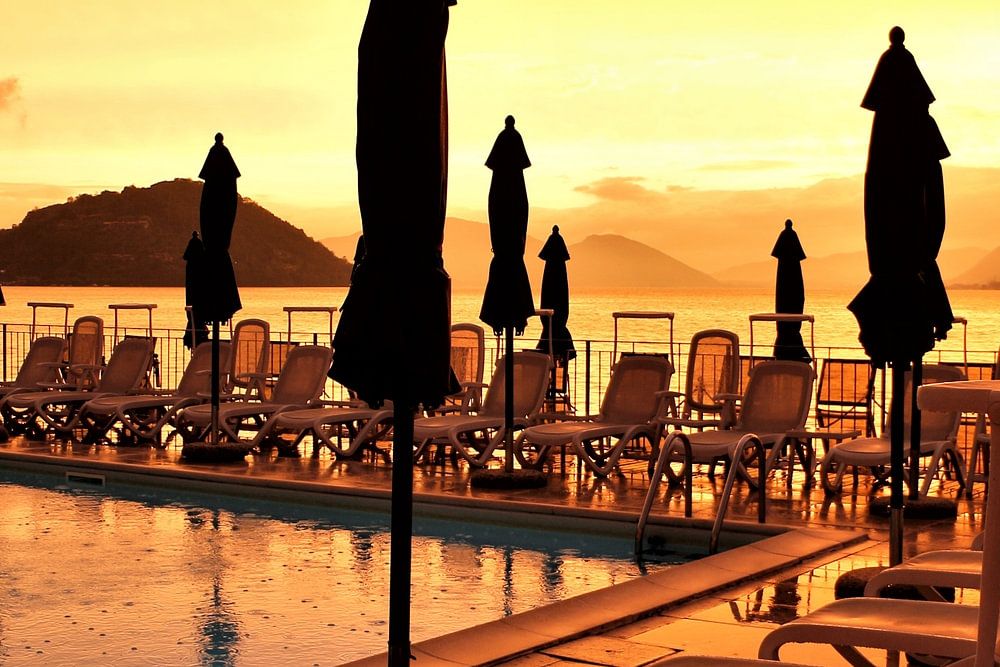 Italy, swimming pool at Hotel Rivalago, view on Lake Iseo