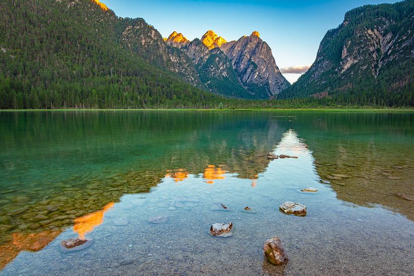 The setting sun bathes the peaks above Lake Dobbiaco in the Dolomites of South Tyrol in golden evening light. The mountains are reflected on the calm lake.