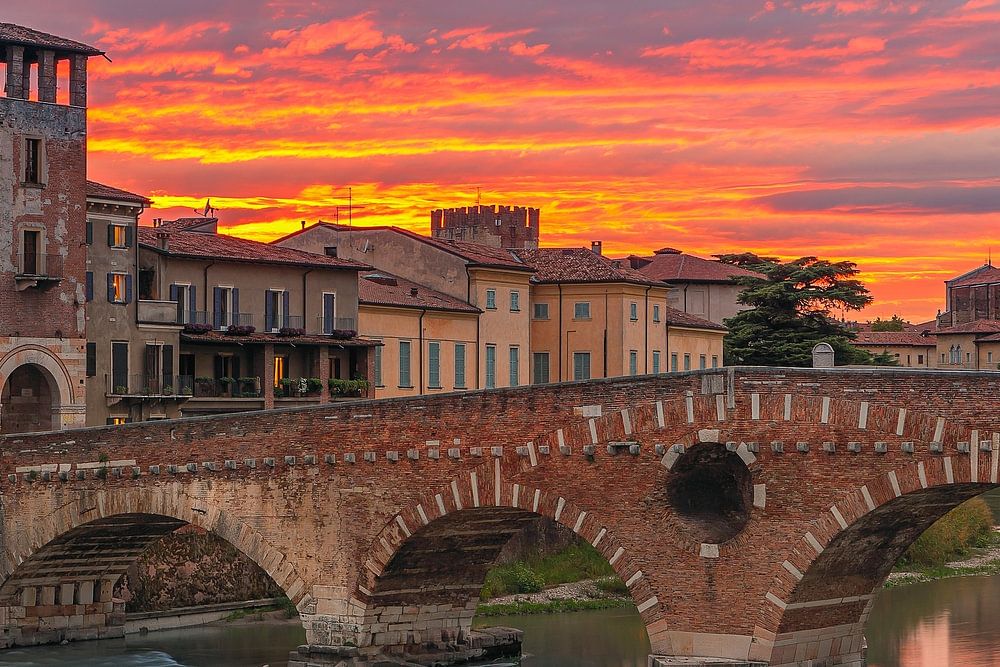 The sunset at the old historic bridge Ponte Pietra in Verona on the river Adige in the province of Veneto, Italy.
