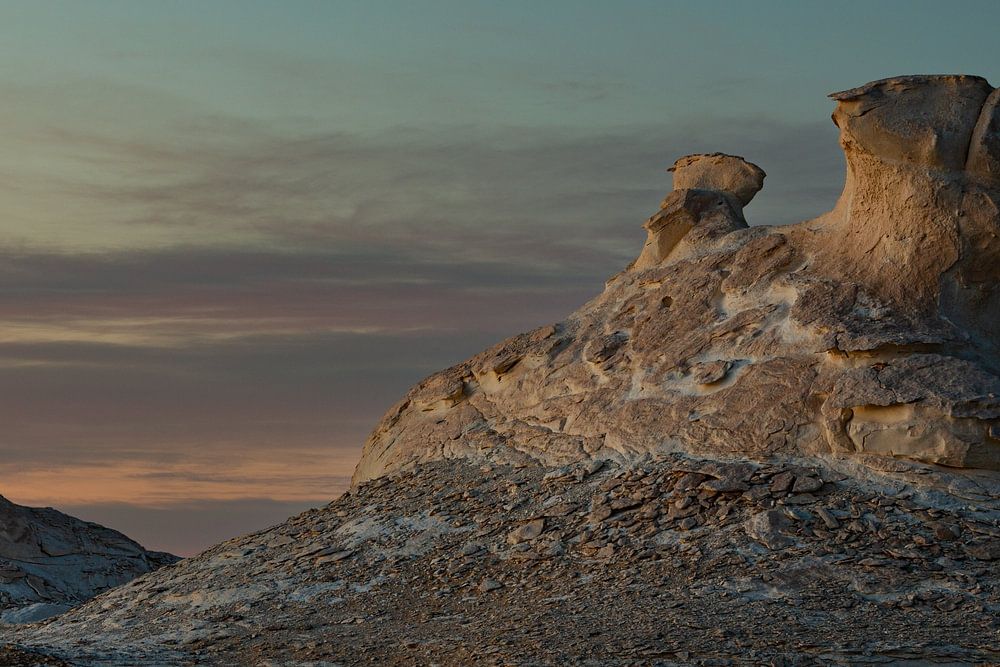 This is a landscape photo of a monolith in the White Desert National Park in Egypt. This desert is a remnant of a sea. monoliths stick out of the soil formed by the sand from sandstorms that have an abrasive effect.The soil is of white limestone that is more or less covered with sand.The desert is located in the western part of Egypt bordering Libya.