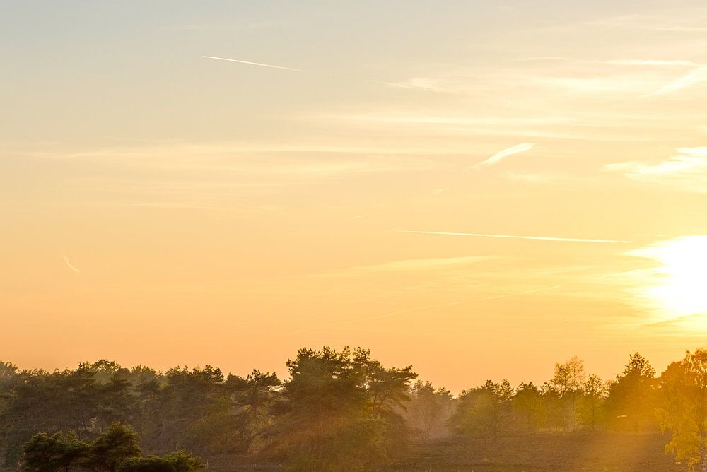 A sunset in Zonhoven, Belgium with a lonely conifer in the bog around the pond of nature reserve De Teut.