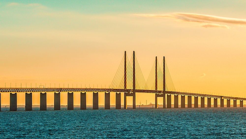 From the Malmö side, the bridge over the Sound was photographed during the golden hour.