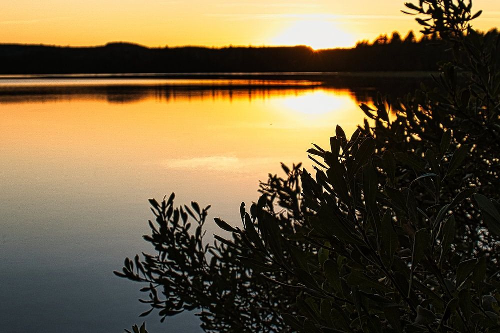 Sunset on a lake in Sweden. The sun is reflected in the calm water. A forest at the edge of the lake completes the romantic picture.